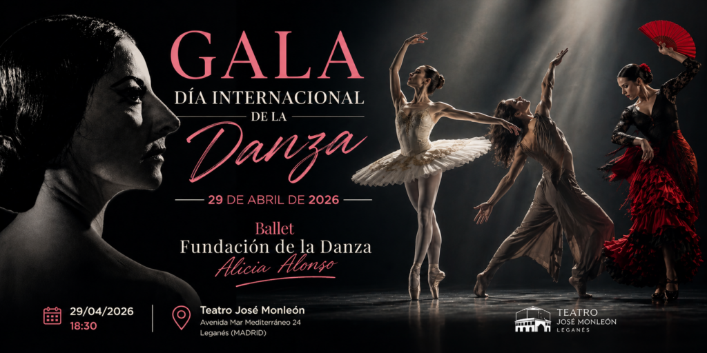 Gala del Día Internacional de la Danza protagonizada por los estudiantes del Instituto Universitario de la Danza “Alicia Alonso”, con un programa mixto que recorre el ballet clásico, la danza contemporánea y la danza española. Una celebración escénica que reúne formación, creación y proyección artística en el Teatro José Monleón de Leganés.